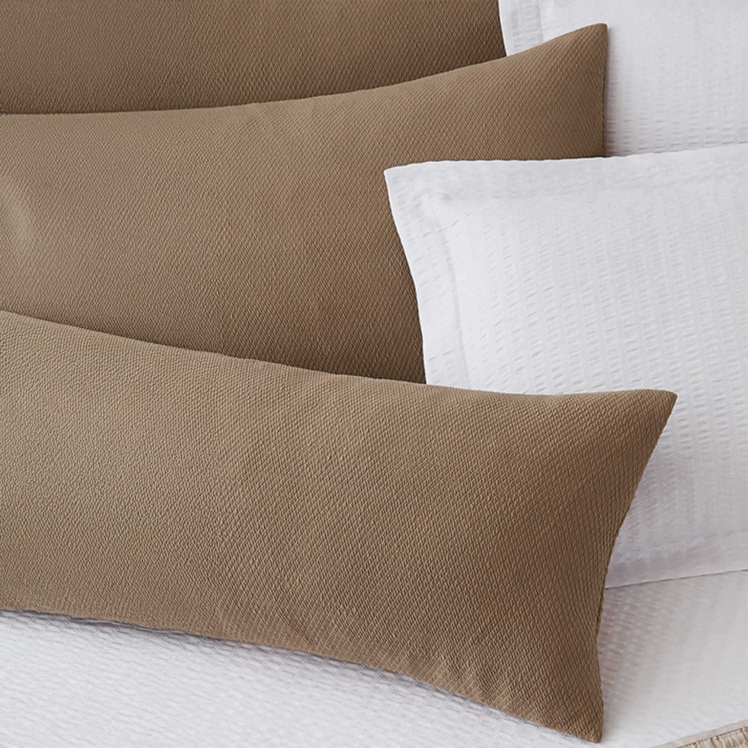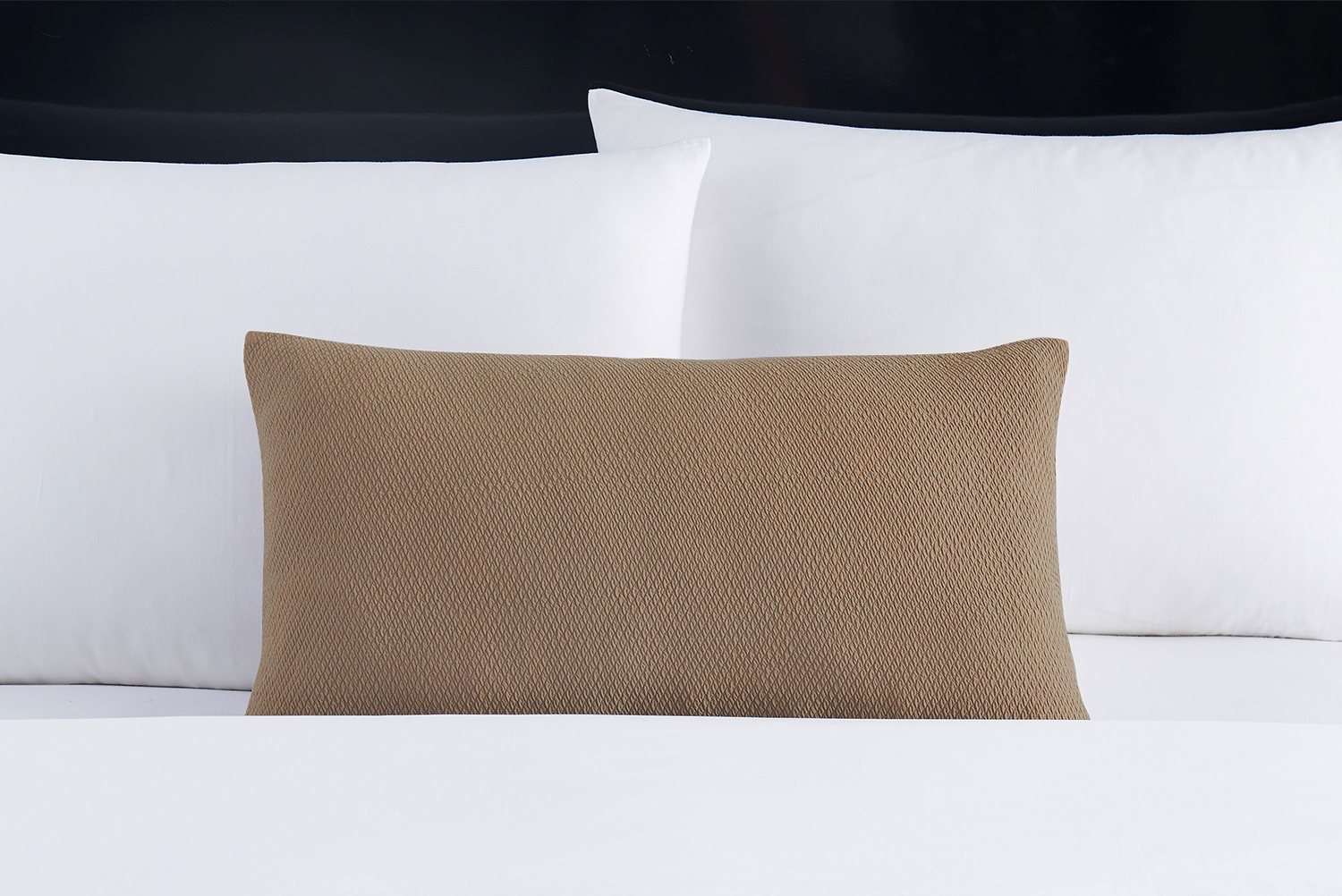 Bolster pillows provide lumbar support for guests and are often layered in front of standard pillows to enhance the bed’s visual appeal.